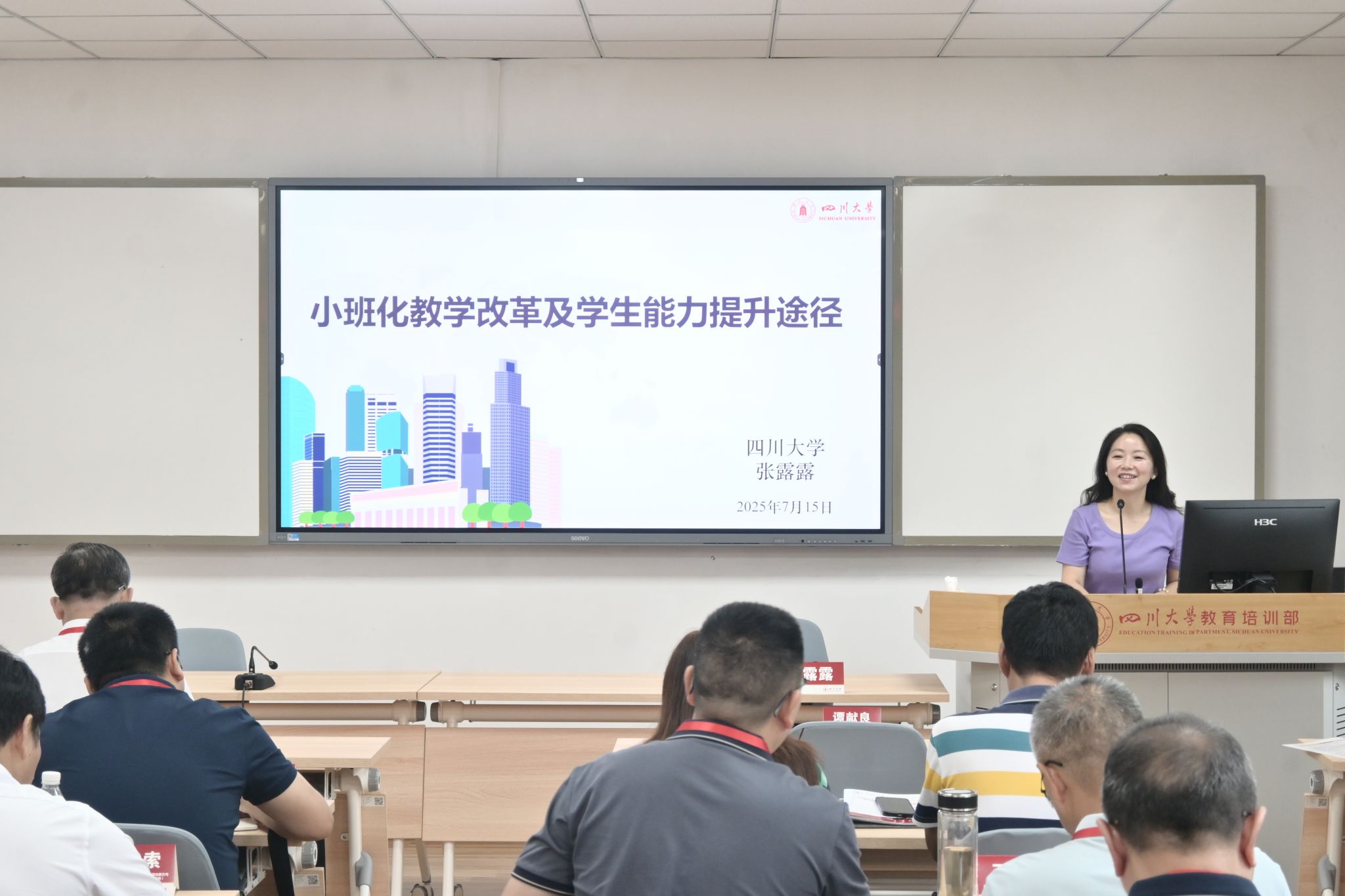 在专题辅导环节,专家们带来了8堂精彩纷呈的专题讲座。四川大学张璐璐副教授分享的《小班化教学改革及学生能力提升途径》,结合她所教授的“学术英语写作”课程,分析了批评性与逻辑思维在学术英语写作中的重要性。张红伟教授围绕“为什么要办一流的本科教育”“如何办一流本科教育”等问题,深入探索了从课堂革命到质量革命的川大本科教育。教师教学发展中心林祎老师分享了基于学生高阶思维培养的教师教学创新改革路径。洪玫教授以四川大学国家级一流专业——软件工程专业为例,阐述了应用型本科高校建设国家级一流专业的创新之路。贺喆南教授围绕“什么是‘双一流’建设”“什么是学科建设”等问题,以四川大学学科建设为例,分享了他对“双一流”背景下的学科建设认识与思考。周加贝副教授的《人工智能大模型赋能教学工作的实践与探索》和崔亚强副研究员的《信息化在教学中的应用》,用生动案例解析AI技术如何重塑教学,打开了教学改革的新窗口。冉桂琼研究员结合四川大学获得的国家教学成果特等奖案例,详细阐述了教改项目的申报、教学成果的内涵和凝练,为高校申报教学成果奖提供了清晰的路径指引。